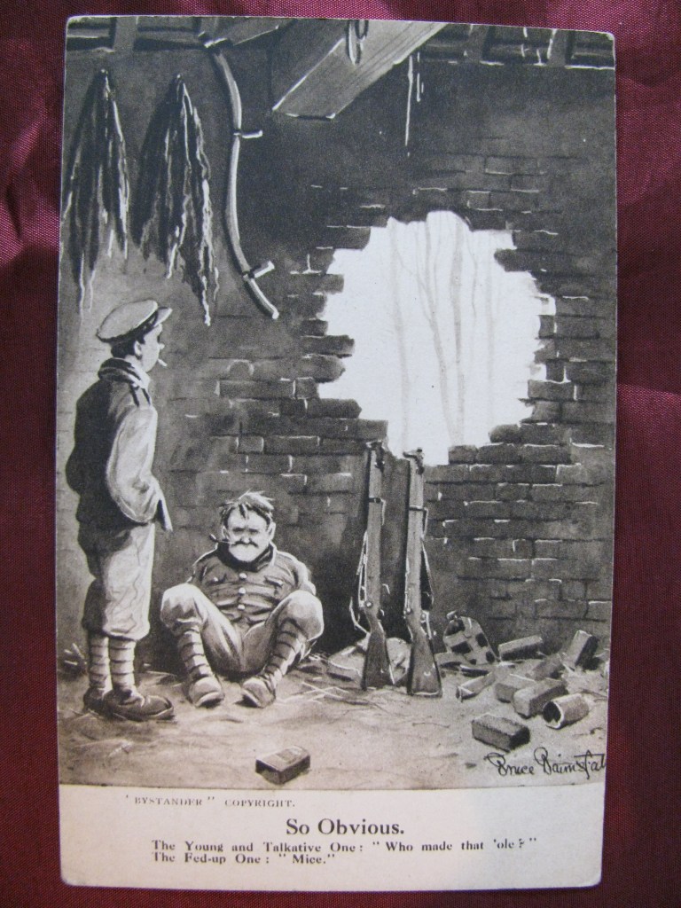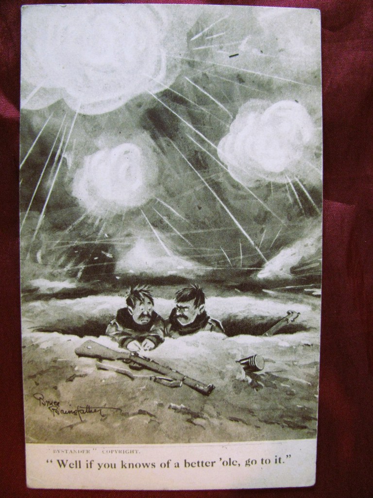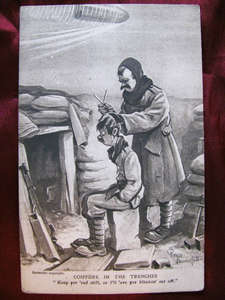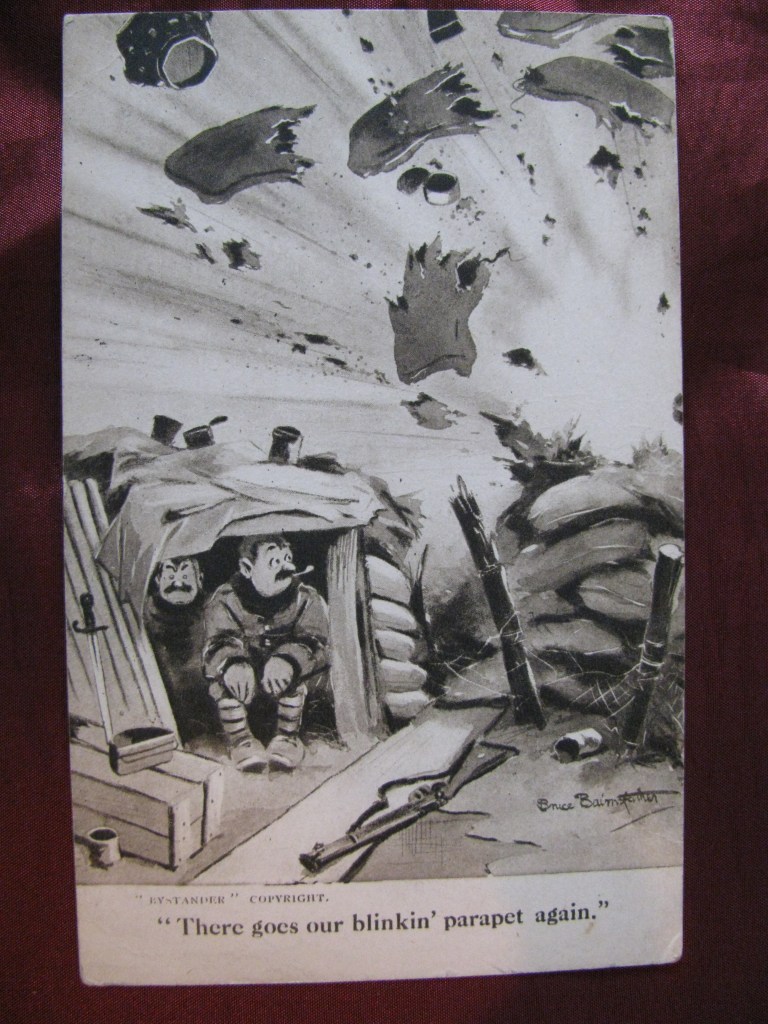 Bruce Bairnsfather began sketching in the trenches. By 1915 his cartoons about army life featured in The Bystander. Wounded in action, he continued to sketch during his recovery. His drawings were widely popular. With his most famous character being Old Bill, a middle-aged soldier with a walrus moustache.