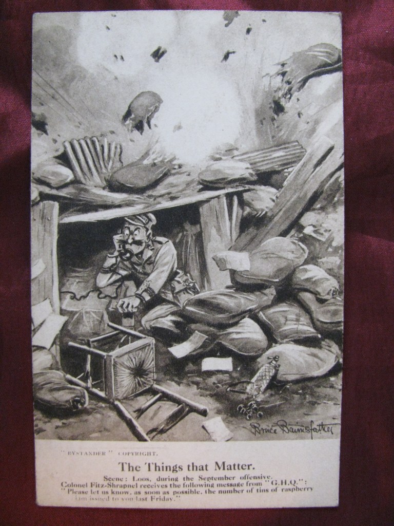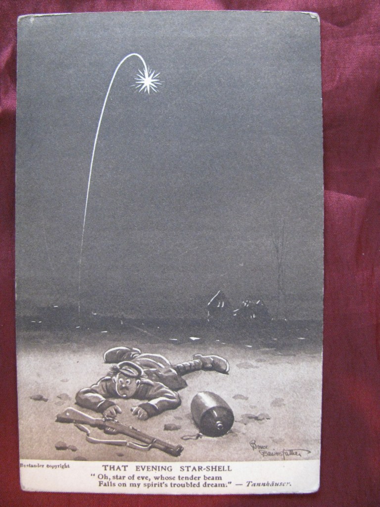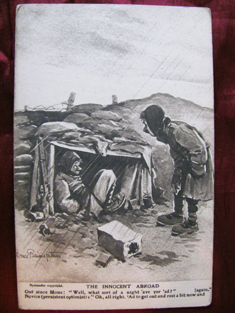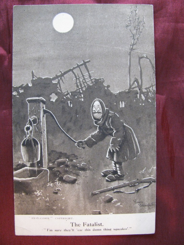 Bruce Bairnsfather began sketching in the trenches. By 1915 his cartoons about army life featured in The Bystander. Wounded in action, he continued to sketch during his recovery. His drawings were widely popular. With his most famous character being Old Bill, a middle-aged soldier with a walrus moustache.